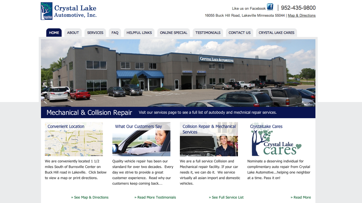 Crystal Lake Automotive is a locally-owned, family business, involved in the communities they serve. The Crystal Lake Automotive philosophy is: “we don’t have a sales department, we have a service department. Our staff will walk you through all your options and give you the information you need to make decisions about your car.” Crystal Lake Auto is conveniently located in Lakeville, MN, just south of 494.